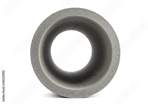 A close up view of a gray concrete pipe with a circular hole on a white background in studio lighting