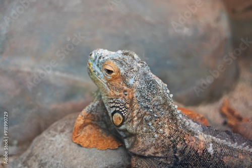 A close up view of a lizard comfortably laying on a rock surface