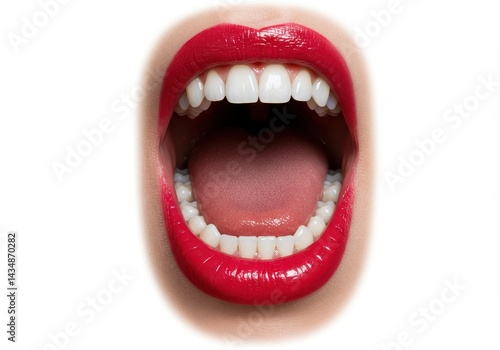 A close up view of an open mouth with red lipstick and white teeth on a white background