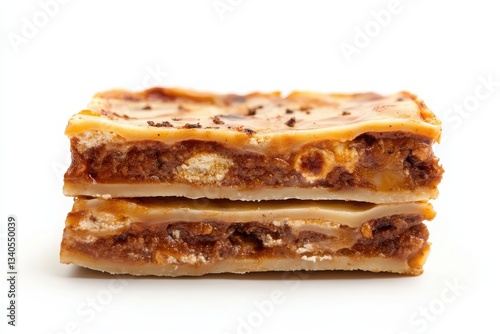 A close up view of two stacked dessert bars with a caramel topping on a white background