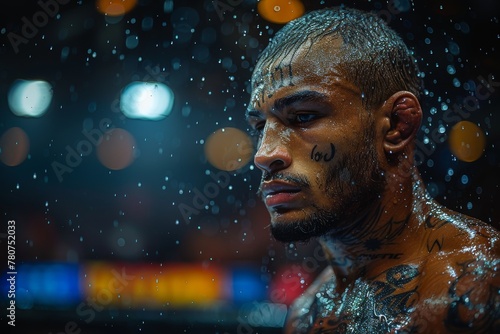 A close-up image capturing the intense details of a tattooed athlete's skin glistening with raindrops, showcasing the physicality of sport