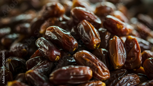 A close-up image of a large pile of dates, showcasing their rich texture and dark brown color.