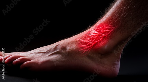 A close-up image of a male ankle with a red glowing area, highlighting the pain and discomfort from an injury or strain.