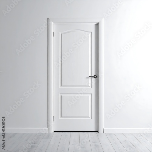 A close-up image of a white, panelled interior door centered in a white room with light wood flooring