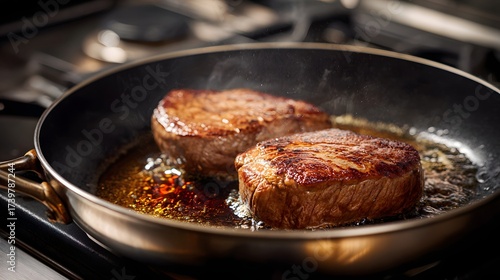 A close-up image of two thick, well-seared beef steaks sizzling in hot oil within a black frying pan on a stovetop.