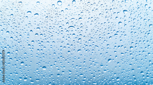 A close-up image of water droplets on a glass surface, creating a textured, soothing blue background.