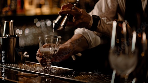A close-up of a bartender's hands expertly stirring a drink with a bar spoon.