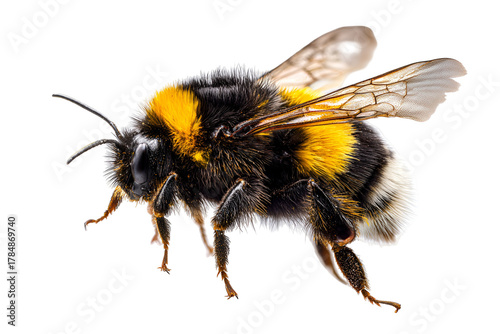 A close-up of a bee displaying its distinctive yellow and black striped body, isolated on transparent background