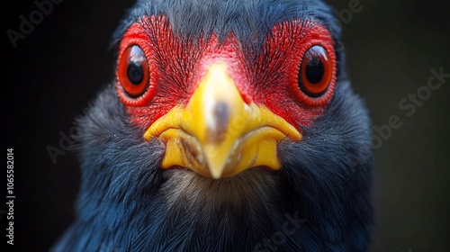 A close-up of a bird's face with bright red eyes and a yellow beak.