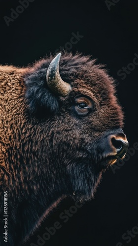 A close-up of a bison's head showcasing its fur and horns against a dark background.