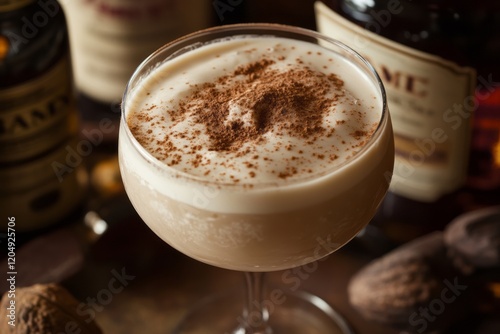 A close-up of a Brandy Alexander cocktail in a chilled coupe glass, the creamy brown drink.Brandy and cream.Brandy alexander.Classic brandy alexander.Brandy cocktail.Cream cocktail.