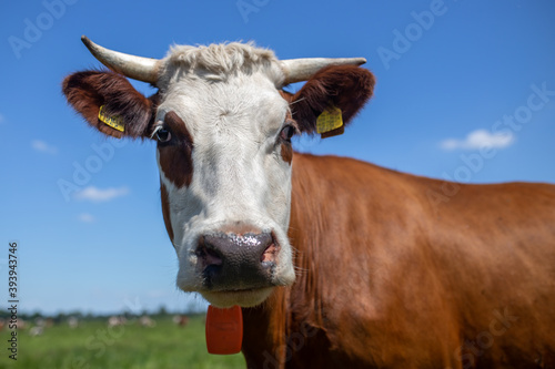 .A close-up of a brown and white cow standing in a pasture