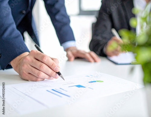 A close-up of a business professional signing documents, with graphs and charts visible, indicating a collaborative work environment.