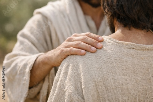 A close-up of a comforting hand on a man's shoulder, showcasing a bond of support and empathy.
