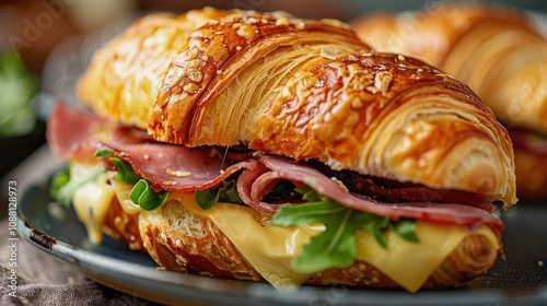 A close-up of a delicious ham and cheese croissant sandwich with arugula.