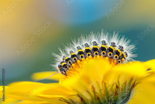 A close-up of a fuzzy caterpillar with black and yellow markings resting on a bright yellow flower petal.