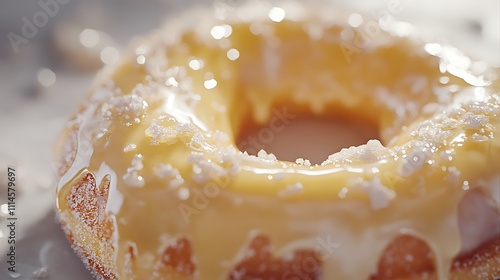 A close-up of a glazed donut with yellow icing and sprinkles, highlighting its texture.