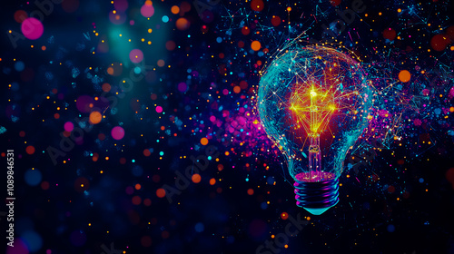 A close-up of a glowing light bulb against a dark background, featuring vibrant neon colors like blue and purple.