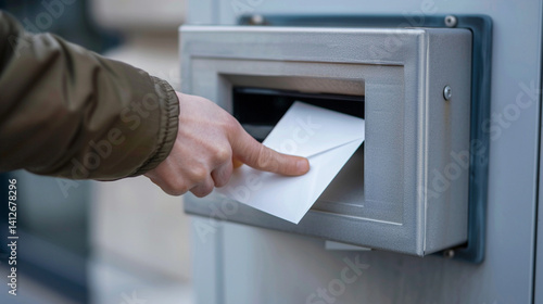 A close-up of a hand placing a sealed envelope into a ballot drop box. stock image, hd quality, natural look, blog post