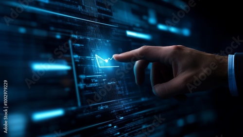 A close-up of a hand pushing a button on a touch screen interface, showcasing technology and communication in a modern office setting