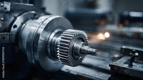 A close-up of a high-precision industrial gear machining on a metal lathe