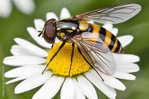A close-up of a hoverfly on a daisy, with its striped body and delicate wings in sharp detail, realistic and vibrant