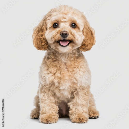 A close-up of a light brown Cockapoo dog sitting on a light background with space for text.