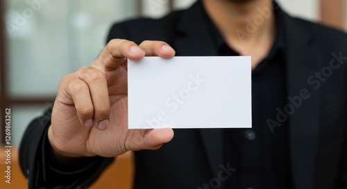 A close-up of a person holding a blank white business card at arm's length featuring a warm and inviting indoor setting the individual is wearing formal attire