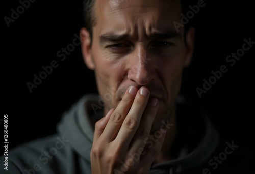 A close-up of a person's face coughing, isolated against a black background.
