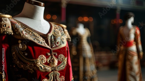 A close-up of a red velvet dress with gold embroidery on a mannequin in a museum display.