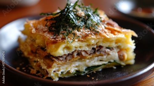 A close-up of a single slice of okonomiyaki, showcasing the layers of ingredients, garnished with mayonnaise, seaweed flakes, and bonito flakes for a delicious appeal.