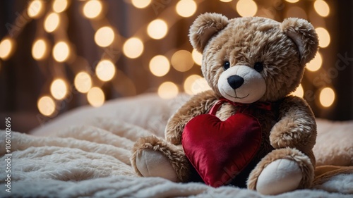A closeup of a soft plush teddy bear holding a red heart, perfect for expressing love and warmth on special occasions or during the holiday season