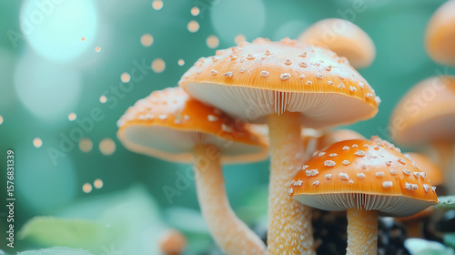 A close-up of a vibrant mushroom with delicate gills, standing tall on lush moss, bathed in soft natural light with a dreamy green forest background.