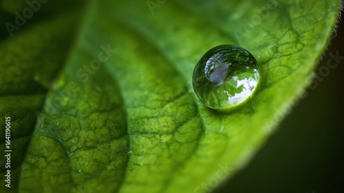 A close-up of a water droplet resting on a vibrant green leaf, reflecting the surrounding foliage in its surface, showcasing nature's intricate beauty.