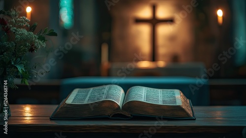 A close-up of an aged Bible open on a wooden altar with a cross in the background inside a serene Protestant church.