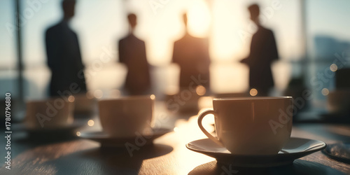 A close-up of coffee cups with businesspeople in the background engaged in discussion during a meeting.