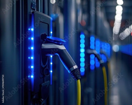 A close-up of electric vehicle charging stations illuminated by blue lights, showcasing modern technology in a sleek, dark environment.