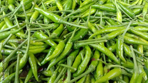 A close-up of green chilies, highlighting their fresh green color and smooth texture. Fresh agricultural produce. High Angle.
