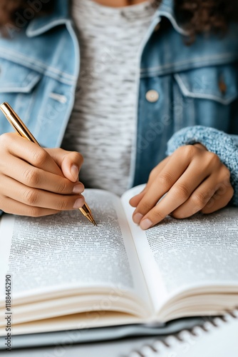 A close-up of hands holding a pen, highlighting text in an open book, symbolizing focus and study in an academic setting