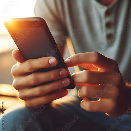 A close-up of hands holding and using a black smartphone with a bright light source behind