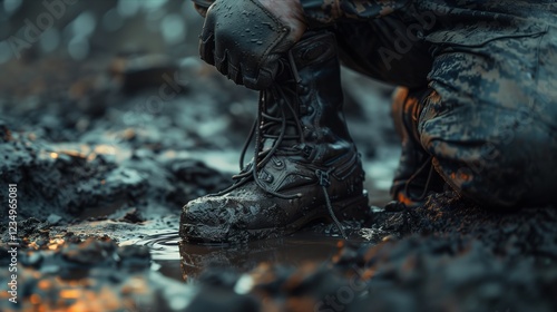 A close-up of muddy boots as a person ties laces in a rugged outdoor setting.