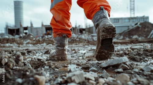 A close-up of muddy work boots walking through a construction site, capturing the rugged and demanding nature of the worker's environment.