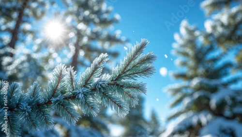 A close-up of pine tree branches covered in snow with sunlight shining through against a blue sky.