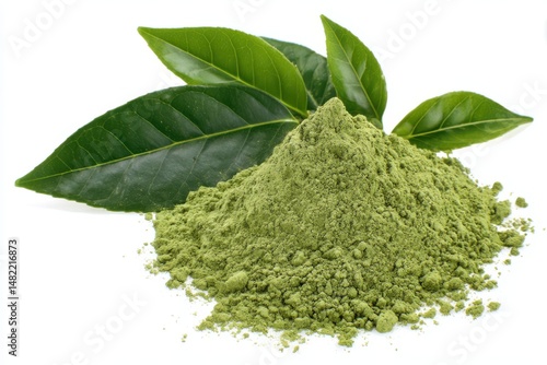 A close-up of vibrant green tea powder with a sprinkle of broccoli on a rustic wooden background.