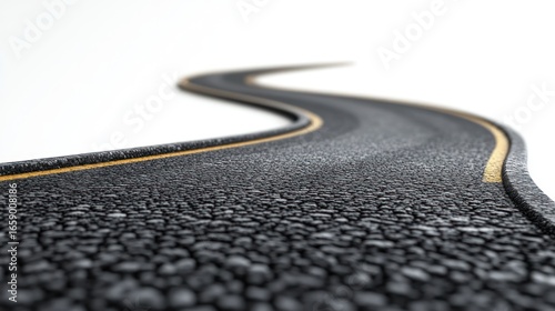 A close-up perspective of a winding asphalt road with a yellow lane marker, leading into the distance.