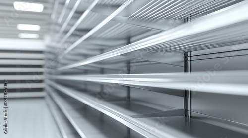 A close-up, perspective view of empty, light gray supermarket shelves, showcasing multiple parallel horizontal shelves supported by metal brackets
