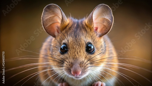 A close-up photo of an isolated wood mouse's face with a hint of whiskers and a pointed snout in the center, lit by soft natural light , close up, wildlife photography