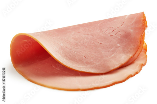 A close-up photograph of a single slice of deli ham against a pure white background.