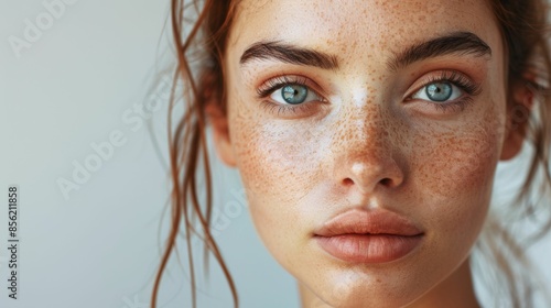 A close-up photograph of a woman with freckles showcasing her blue eyes and full lips with a soft focus on her hair and background.