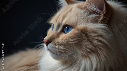 A close-up portrait of a fluffy, white and light-brown cat with bright blue eyes, looking to the side.